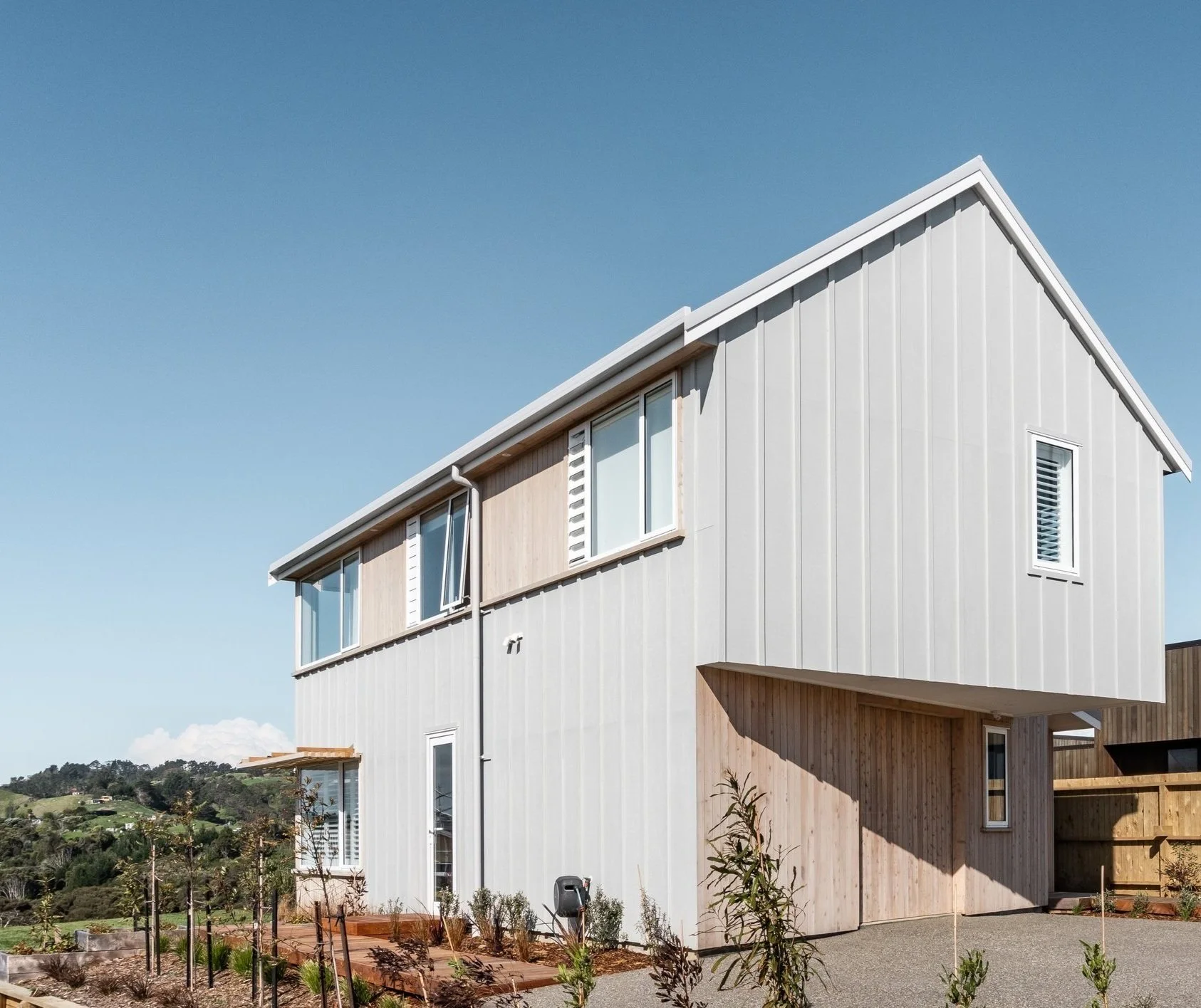 A cantilevered box balanced over interesting angles below, creates a unique architectural statement. Opting for a smaller footprint, there was opportunity for creative design to make the most of the budget. The lower story features a central spine wall angled at 8 degrees, adding a dynamic detail to the internal layout. A standout feature is the macrocarpa sun shades on the northern face of the facade